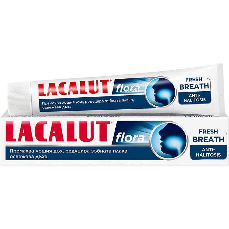Formula spaciala a pastei de dinti Lacalut Flora previne mirosul neplacut al gurii si asigura o respiratie proaspata.
